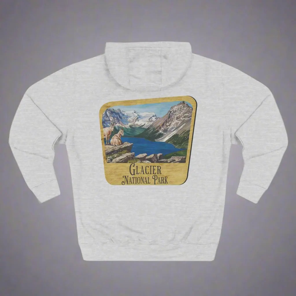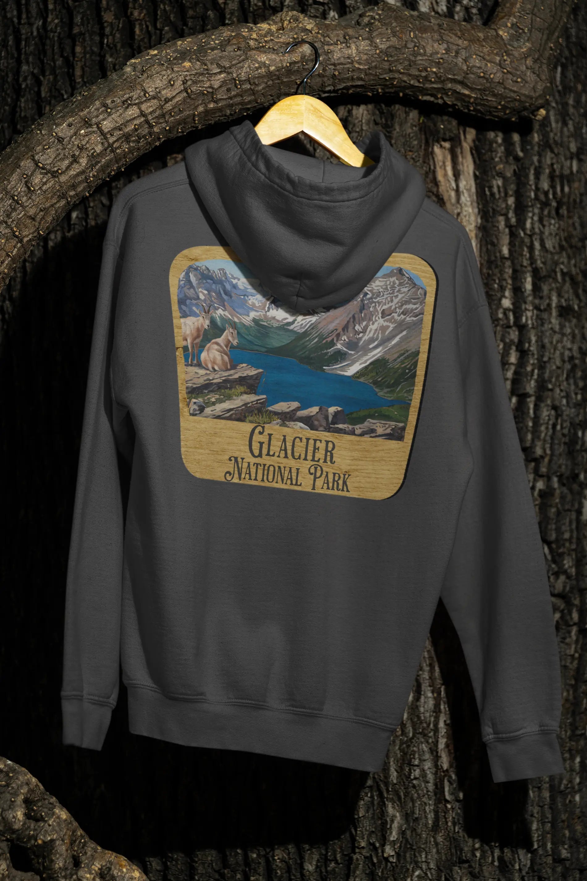 Glacier National Park Unisex Fit Fleece Hoodie Scenic Mountain Goat View Graphic Wooden Sign