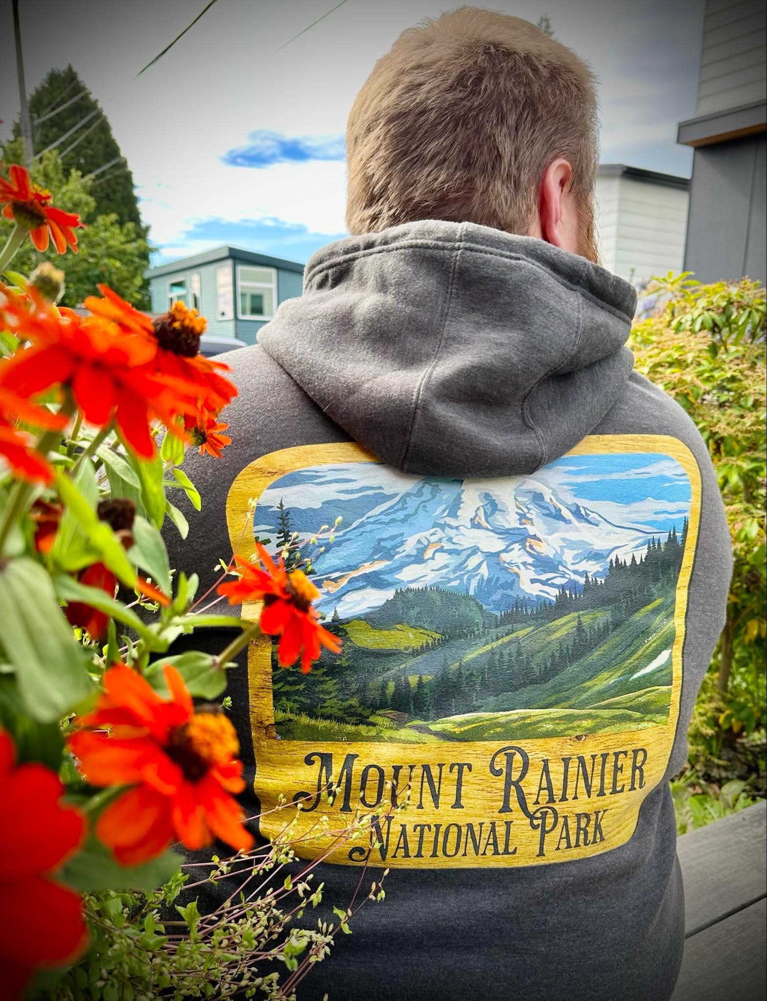 Explore the majestic beauty of Mount Rainier National Park with our exclusive fleece hoodie. This unisex fit hoodie is perfect for nature lovers and adventure seekers alike, as it captures the scenic wooden mountain sign that is emblematic of this renowned national treasure. Crafted with comfort and style in mind, this hoodie offers a warm embrace for those chilly hikes or casual outings.